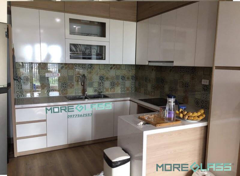 Ấn tượng với mẫu thiết kế tủ bếp phong cách hiện đại với hệ tủ bếp chữ L kiểu dáng đơn giản, phối cùng mặt bàn đá nhân tạo và kính ốp bếp họa tiết Mosaic, tạo nên một bức tranh thị giác ấn tượng, phân mảnh và hòa trộn màu sắc độc đáo như kính vạn hoa
