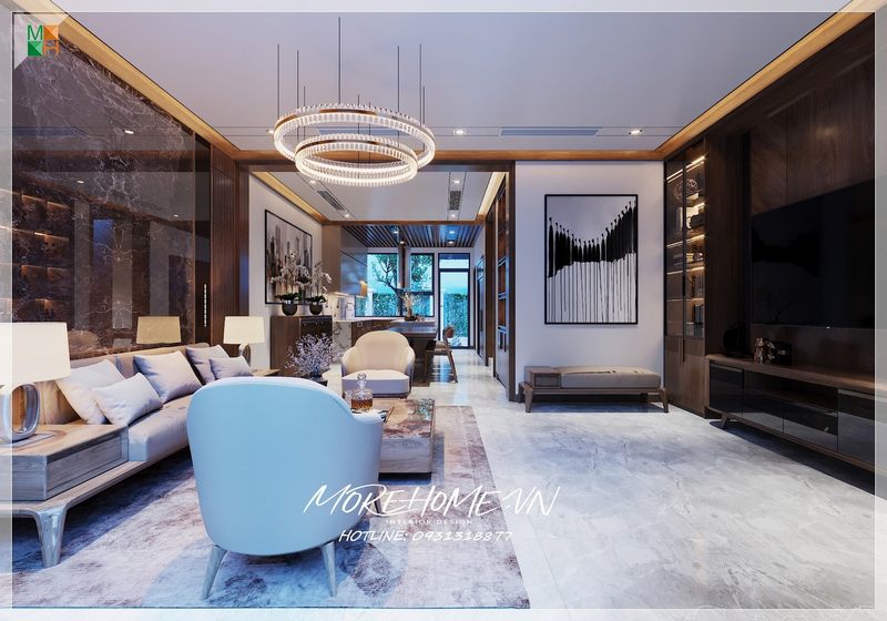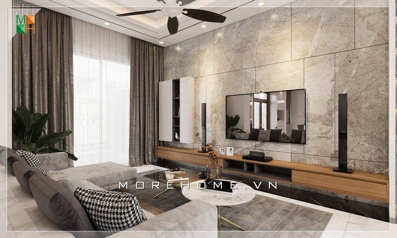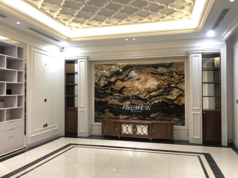 Phần vách tivi được thiết kế ốp đá nhân tạo tấm lớn vân mây ấn tượng và đắt tiền.