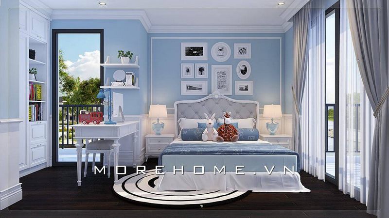 Bố trí nội thất phòng ngủ bé trai đẹp đầy khoa học, KTS lựa chọn gam màu xanh đẹp mắt tạo sự thích thú hơn cho phòng ngủ của con