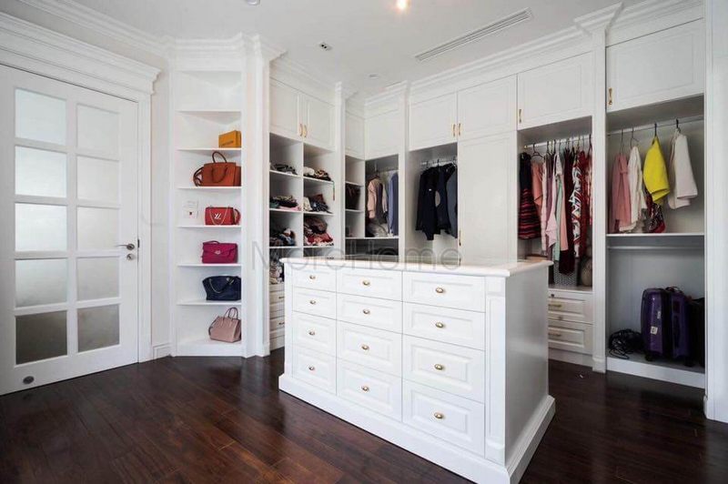 Phòng thay đồ với bố trí kệ tủ chạm trần đầy tiện nghi cho gia chủ sử dụng
