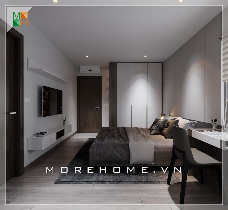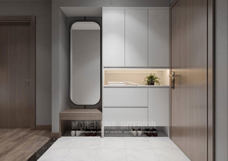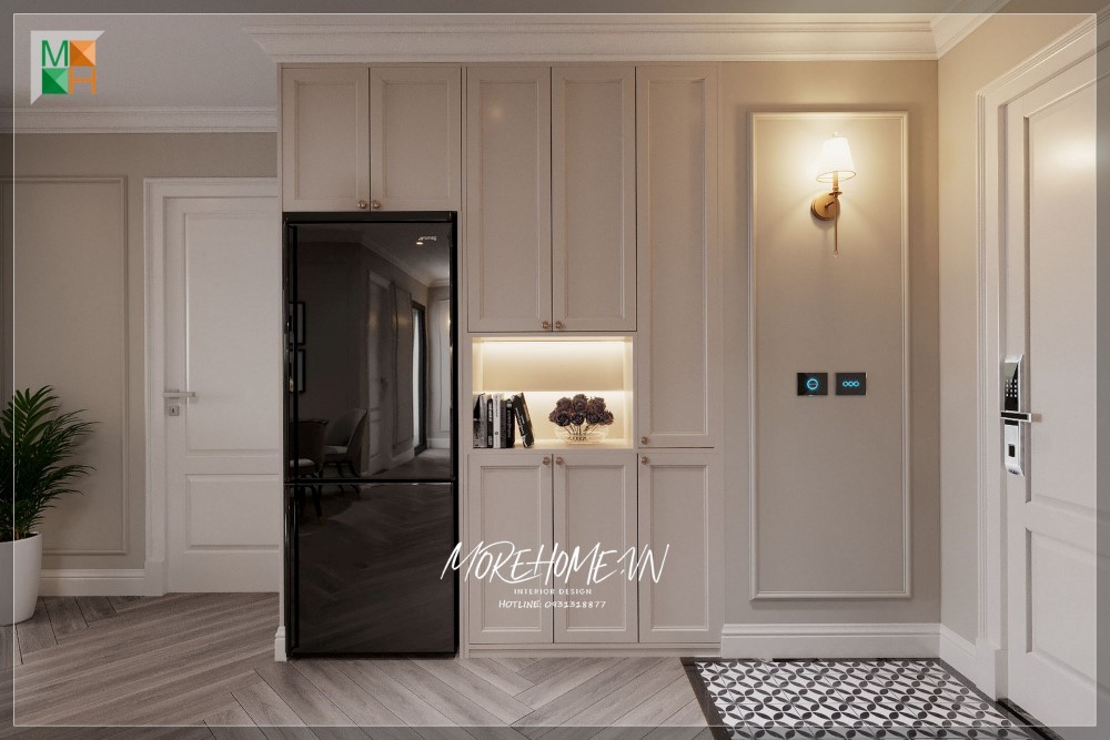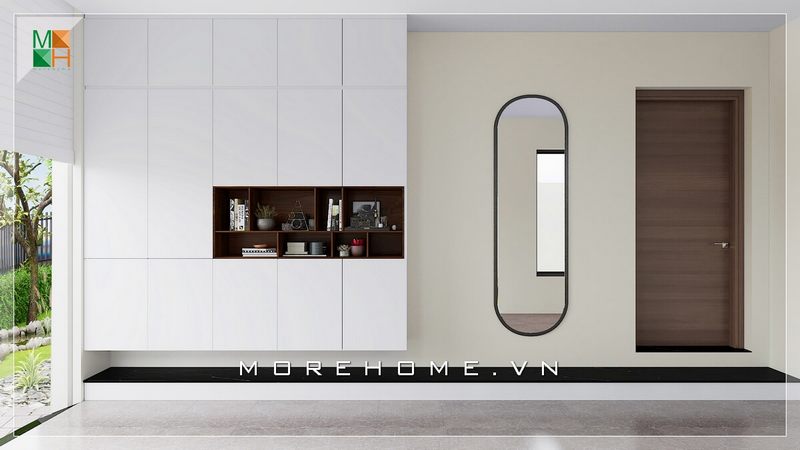 Tủ kệ âm tường màu trắng giúp không gian phòng thông thoáng, sáng sủa và có cảm giác rộng mở hơn.