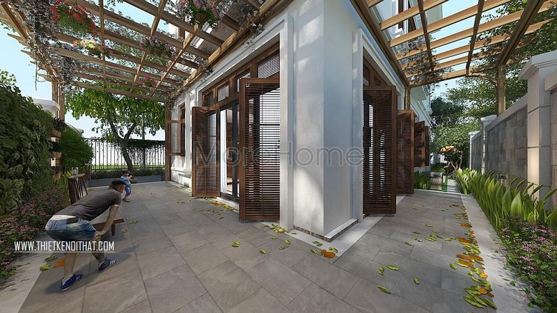 Cửa gỗ biệt thự màu trắng khung gỗ tự nhiên sang trọng, thể hiện đẳng cấp của gia chủ trong quá trình chọn lựa nội thất