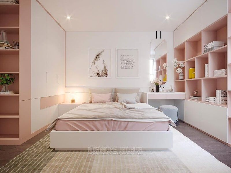 Mẫu thiết kế nội thất phòng ngủ cao cấp với cách bố trí nội thất một cách hợp lí, khoa học mang đến sự nhẹ nhàng, dễ thương với tone màu hồng cho phòng ngủ của bé gái