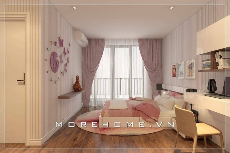 Nội thất phòng ngủ bé gái nhẹ nhàng, dễ thương, chiếc tủ quần áo âm tường kịch trần tạo cảm giác cho căn phòng thêm phần cao và thoáng hơn