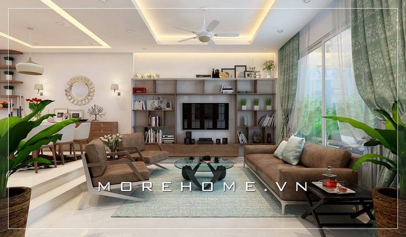 Thiết kế phòng khách mở với ý tưởng tận dụng tối đa nguồn sáng tự nhiên.