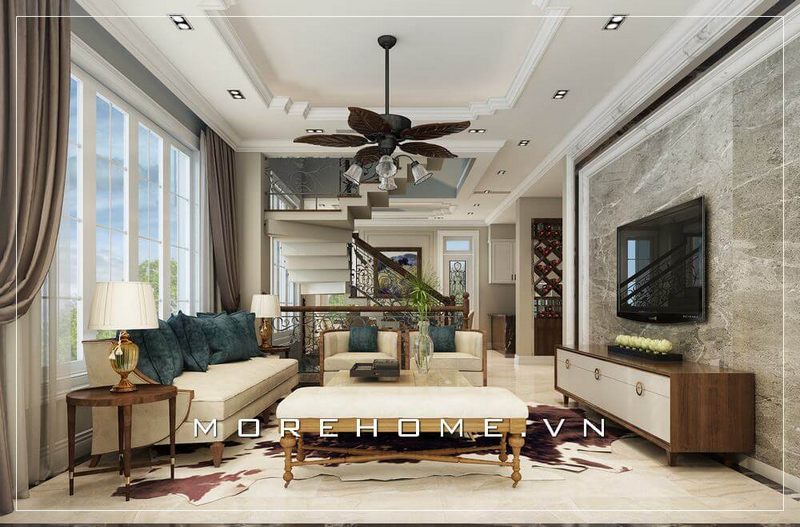 Thiết kế nội thất phòng khách biệt thự, nhà phố đẹp, hiện đại với đồ nội thất phong cách tân cổ điển sang trọng, xu hướng được nhiều khách hàng lựa chọn cho trang trí nhà.