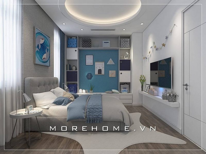Bức tường ở phái đầu giường được gia chủ tạo điểm nhấn với mẫu giấy dán tường màu xám cùng tranh canvas treo tường tạo nên vẻ đẹp nhẹ nhàng cho phòng ngủ của con