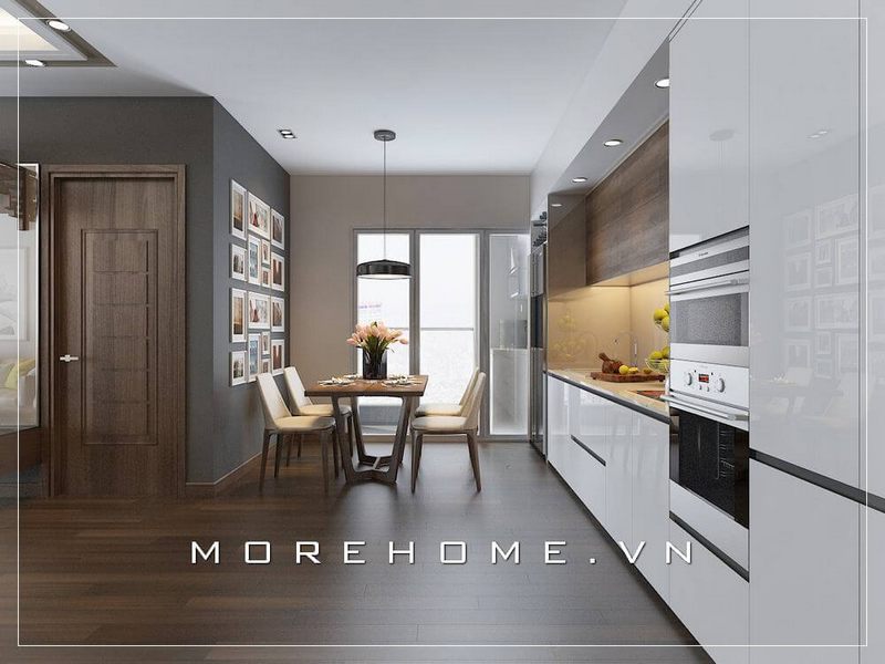 Mẫu tủ bếp gỗ acrylic hiện đại màu trắng cho phòng bếp chung cư hiện đại