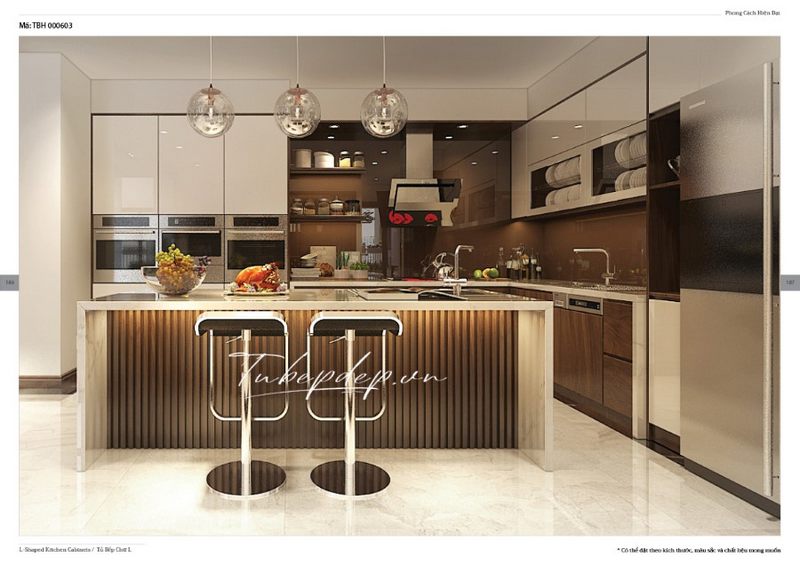 Hệ thống tủ bếp, đảo bếp được thiết kế bằng chất liệu gỗ acrylic, loại gỗ được sử dụng thông dụng hiện nay