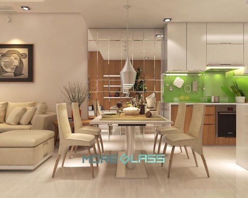 Trong một không gian mở, các khoảng tường liên thông giữa các không gian cần được trang trí cho thu hút. Ở đây MoreGlass bố trí một chiếc gương viền gỗ hợp với đồ nội thất chung của căn phòng.