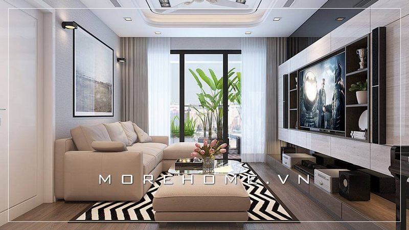 Phòng khách chung cư thiết kế đẹp mắt với đồ nội thất gỗ công nghiệp