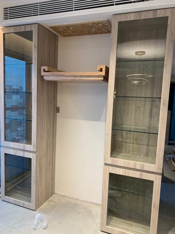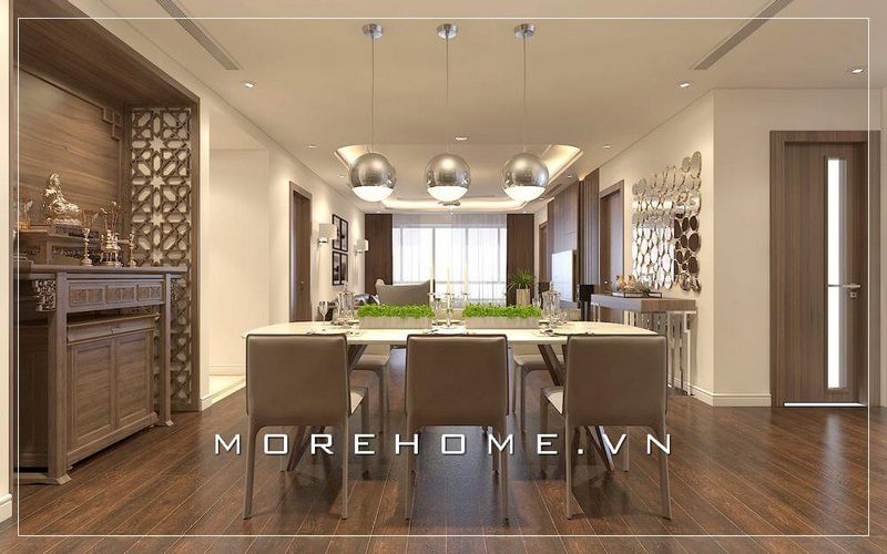 Vị trí bàn thờ chung cư, tủ thờ chung cư được thiết kế và thi công liền kề với không gian phòng khách. Morehome thi công hoàn thiện bàn thờ gia tiên hiện đại bằng gỗ tần bì nhập khẩu phun sơn màu cánh gián đẹp cho căn hộ chung cư Thăng Long Number One tại hà nội