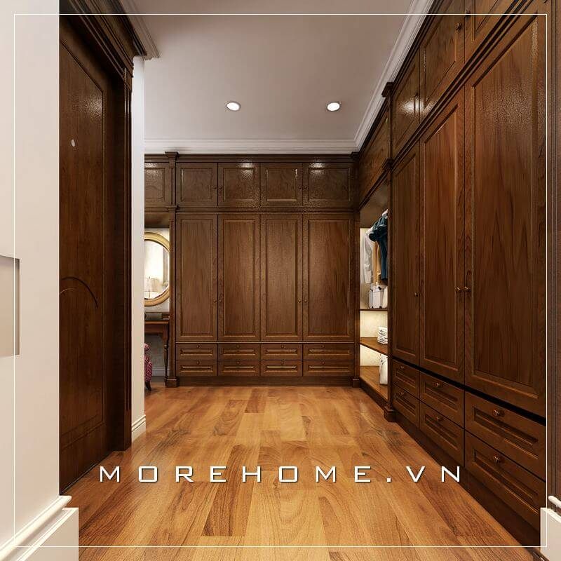 Tủ quần áo biệt thự được làm từ chất liệu gỗ óc chó cao cấp nhập khẩu, gam màu nâu chủ đạo mang lại sự sang trọng và ấm cúng hơn