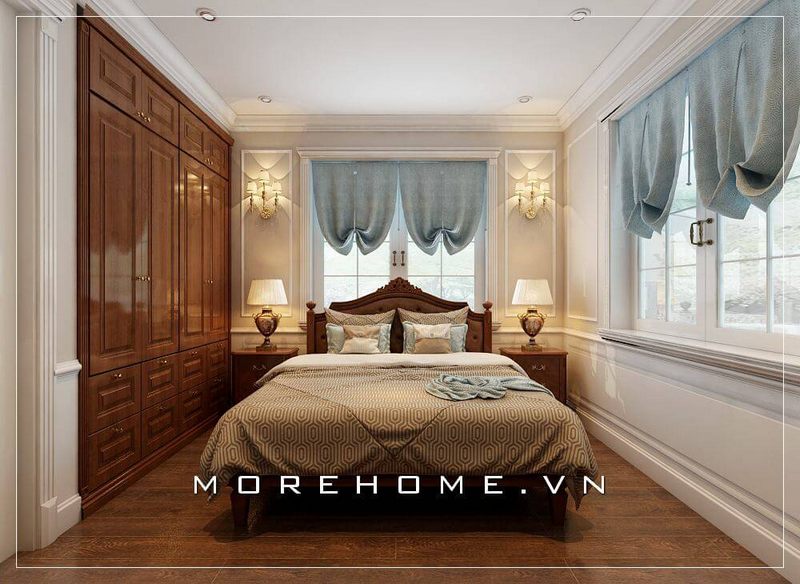 Tủ quần áo gỗ màu nâu sang trọng gợi lên nét ấm cúng, thoải mái cho chủ nhân căn phòng