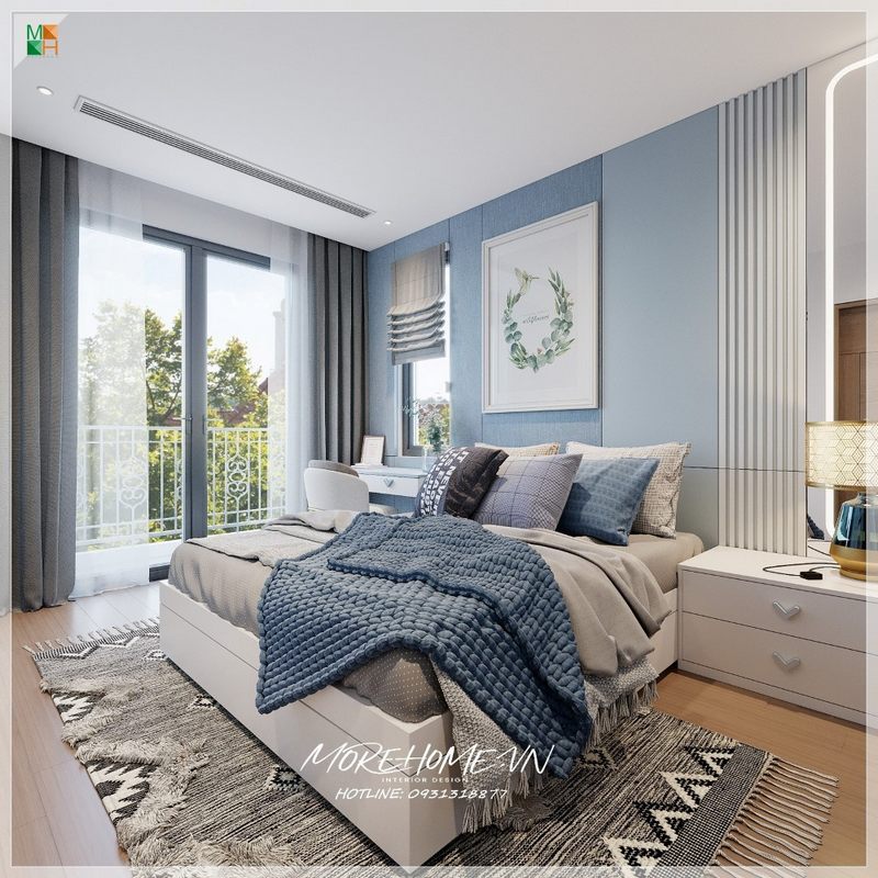 Phòng ngủ được thiết kế với tone màu trắng xanh chủ đạo kết hợp đem tới không gian mát mẻ hiện đại cho nhà phố, biệt thự
