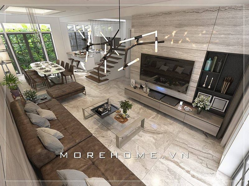 Cách bố trí nội thất phòng ăn liền bếp mang nét ấn tượng bởi sự ngăn nắp và khoa học. Bộ bàn ăn hiện đại được đặt ngay giữa phòng tạo sự thông thoáng và cao cấp.
