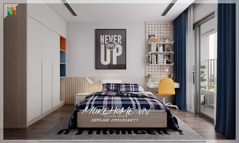 Không gian phòng ngủ được thiết kế theo phong cách thể thao, chiếc giường bằng gỗ công nghiệp vuông vắn hiện đại với gam màu trắng ưa nhìn.
