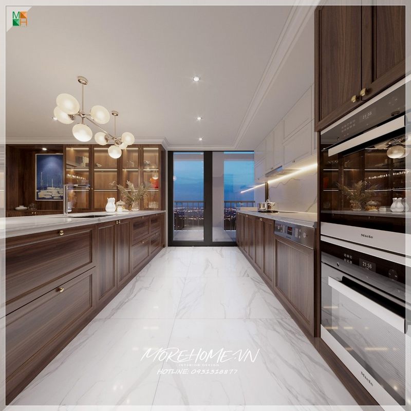 Thiết kế nội thất phòng bếp căn hộ cao cấp phong cách tân cổ điển.