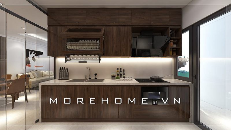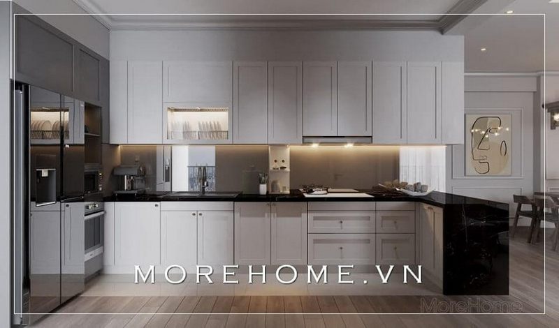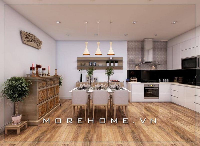 Morehome gợi ý cho bạn mẫu thiết kế nội thất phòng bếp hiện đại liền phòng ăn đẹp, đơn giản phù hợp cho không gian chung cư có diện tích hạn chế.