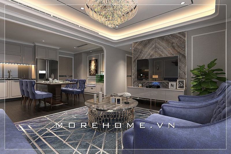 Bộ bàn ăn 6 ghế đẹp sẽ là điểm nhấn ngăn cách hai không gian phòng khách liền bếp cho căn hộ chung cư
