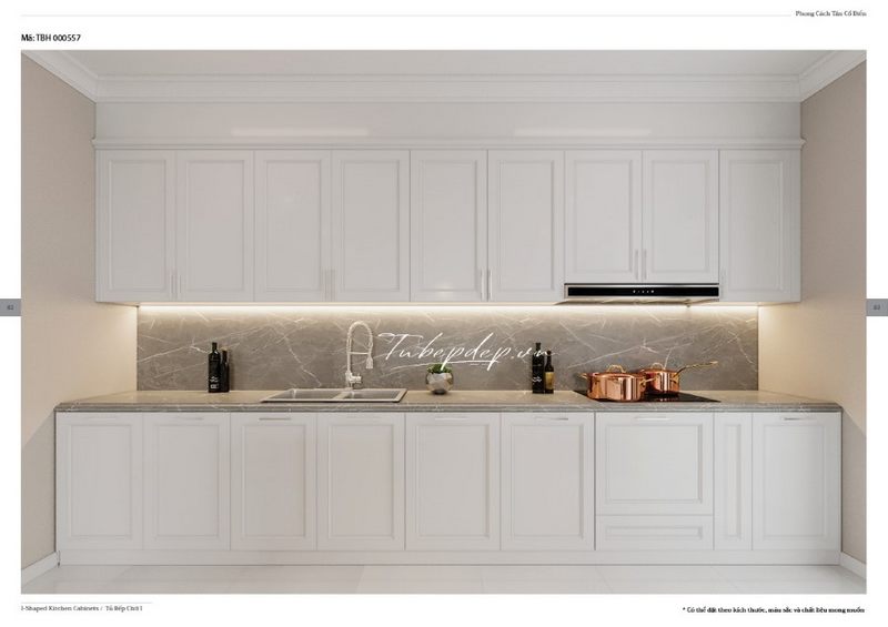 Nhẹ nhàng và tinh tế là vẻ đẹp của thiết kế khu vực bếp nấu màu trắng kiểu tân cổ điển hình chữ i do các KTS hàng đầu tư vấn