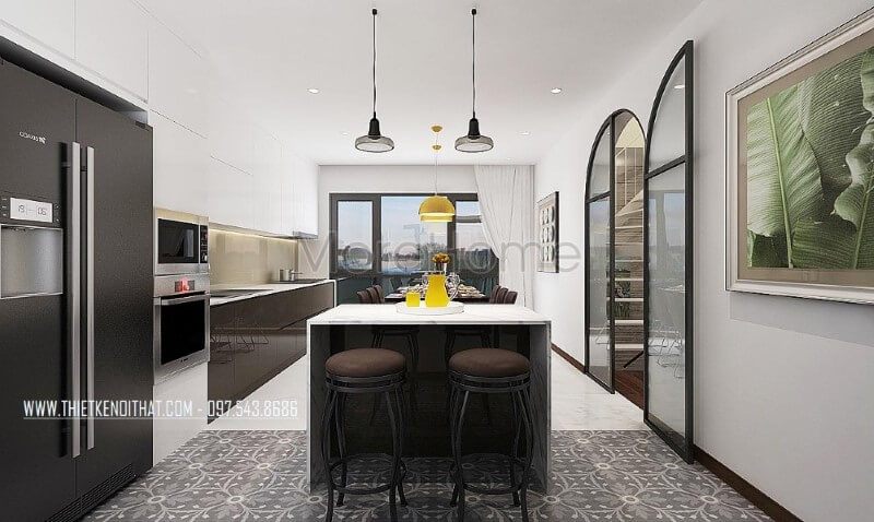 Thiết kế hệ cửa lớn và hợp lý giúp phòng bếp ăn luôn được thông thoáng cùng cách trang trí đẹp mắt sẽ tạo nên không gian đẹp, sang trọng cho biệt thự, nhà phố.